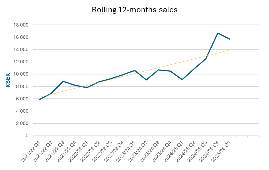 Net sales for the first quarter amounted to 365 (1 338) KSEK. Operating results before depreciation (EBITDA) amounted to -7 048 (-4 733) KSEK for the first quarter. The net result for the first quarter amounted to -8 542 (-5 928) KSEK.